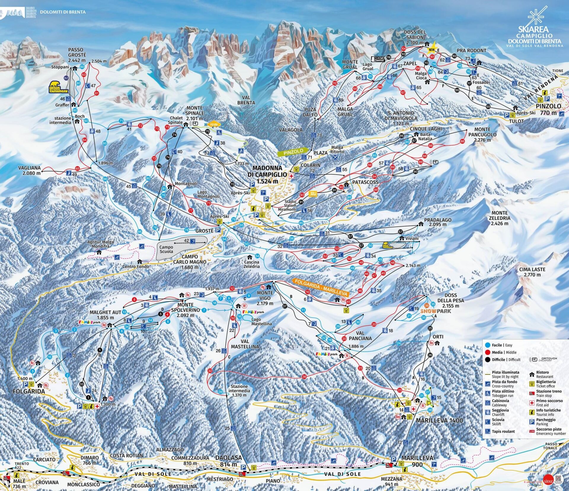 Folgarida Marilleva- wyjątkowy region narciarski oferujący ponad 60 km tras narciarskich (6 trudnych, 8 średnich oraz 23 łatwych), 24 wyciągi w tym 7 gondolowych, 13 krzesełkowych oraz 4 orczykowe i 36 odcinków oraz połączenie między stokami Pinzolo, które można pokonać wyłącznie na nartach.